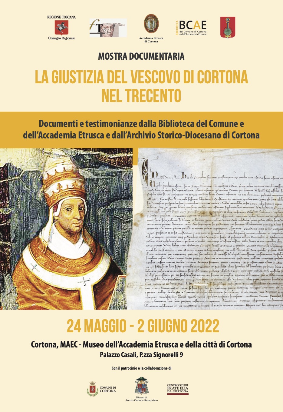 La mostra è realizzata in collaborazione con il Comune, l’Archivio Storico della Diocesi di Arezzo-Cortona-Sansepolcro e il Centro studi frate Elia da Cortona. Gli organizzatori hanno partecipato al bando della Festa della Toscana e, superate le limitazioni del Covid19, hanno calendarizzato questo evento. Si tratta di un progetto articolato su più anni, finalizzato ad approfondire la conoscenza su come è stata amministrata la giustizia a Cortona a partire dal Medioevo fino a tempi recenti.