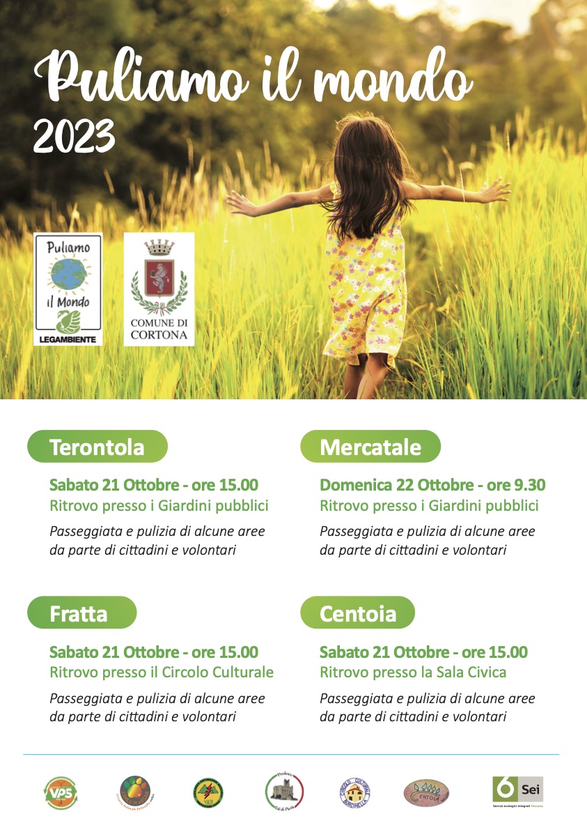 Si rinnova l’appuntamento con «Puliamo il mondo», l’iniziativa di volontariato ed educazione ambientale di Legambiente e Comune di Cortona. Questo fine settimana ci saranno quattro iniziative grazie alla collaborazione di associazioni, proloco e circoli. Sabato 21 ottobre alle 15 i volontari si ritroveranno ai giardini pubblici di Terontola, al circolo culturale di Fratta e alla sala civica di Centoia. A Mercatale l’iniziativa si svolgerà ai giardini pubblici domenica 22 ottobre alle 9,30.